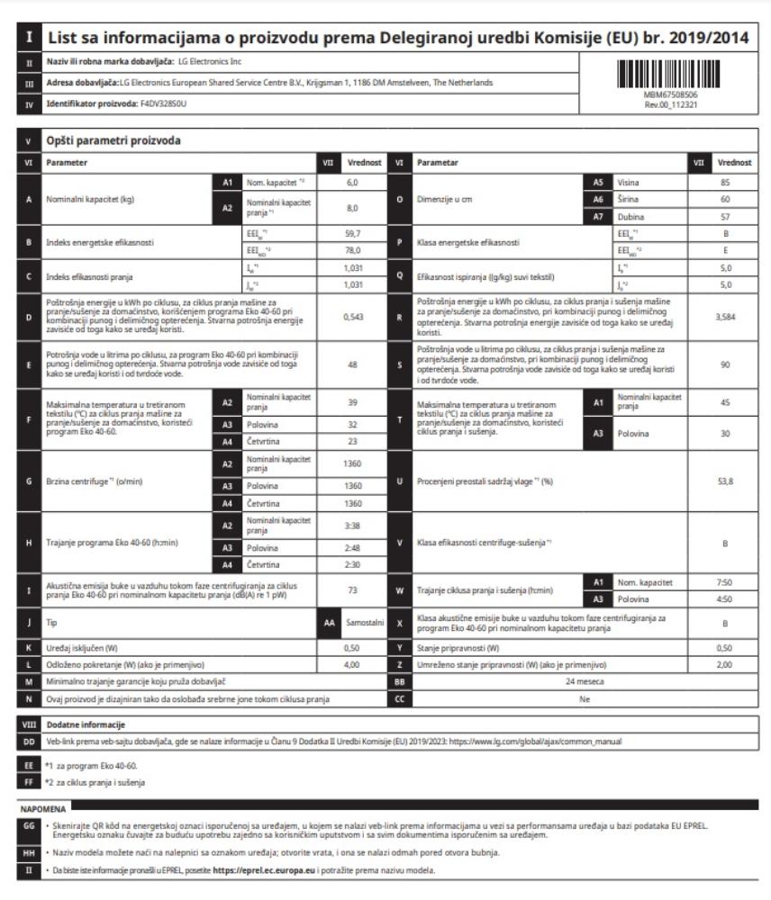 Mašina za pranje i sušenje veša, AI DD, 8/6kg, 1400rpm, Steam, B/E, ThinQ, kaljena staklena vrata, 55cm, Bela