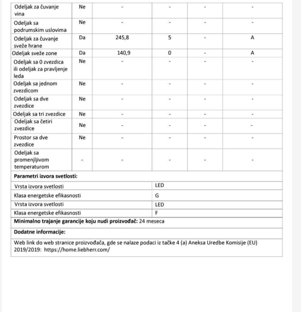 | Funkcije i karakteristike | Klimatska klasa: SN-T Nivo buke: 33 dB Priključna snaga: 1,2 A Napon: 220-240 V ~ Frekvencija: 50-60 Hz Rashladno sredstvo: R 600a Upravljanje: 2,4“ TFT ekran u boji, ekran na dodir i prevlačenje Broj temperaturnih zona: 2 Broj regulisanih rashladnih krugova: 1 Prikaz temperature: odeljak za frižider i BioFresh odeljak HumidityPlus: ne SuperCool: podesivo na uređaju i preko aplikacije Alarm za vrata, hlađenje: podesivo na uređaju i preko aplikacije Noćni režim: podesiv u aplikaciji Zaključavanje ekrana: podesivo na uređaju Kontrolna jedinica: dodir i prevlačenje Rešenje za povezivanje *: mogućnost naknadne ugradnje Podesiv temperaturni opseg, odeljak frižidera: +3°C do +9°C Klimatske zone u odeljku frižidera: odeljak za voće i povrće / odeljak za meso i mlečne proizvode Tehnologija svežine: BioFresh Broj BioFresh sefova: 3 Razvlačenje na teleskopskim šinama: da SoftTelescopic: da Unutrašnje svetlo BioFresh odeljka: LED svetlo Metod odmrzavanja: automatski FreshAir filter: u ventilu Sistem za izvlačenje fioka, odeljak frižidera: potpuno rastezljive teleskopske šine sa mehanizmom za samozatvaranje i mehanizmom mekog zaustavljanja Osvetljenje odeljka za hlađenje: svetlosni panel, obe strane Broj polica za skladištenje, odeljak frižidera: 6 Od toga deljivi: 1 Od kojih podesivih po visini: 5 VarioSafe: da InfinitySpring: ne Skladištenje flaša: integrisano Stalak za flaše: 2 Broj polica za konzerve: 2 VarioBox: na izvlačenje VarioBoxes: 1 Posuda za puter: da Posuda za jaja: podesiva Broj FlexSystem-a: 0 Stalak za skladištenje: stalak za flaše i konzerve Unutrašnja polica za vrata podesiva po visini: postepeno podešavanje InteriorFit: da Suva zadnja ploča: da Materijal suvog zadnjeg zida: nerđajući čelik sa SmartSteel-om Unutrašnji dekor vrata: ne Materijal polica za vrata: staklo sa oblogom od nerđajućeg čelika Materijal polica za skladištenje, odeljak frižidera: staklo |
