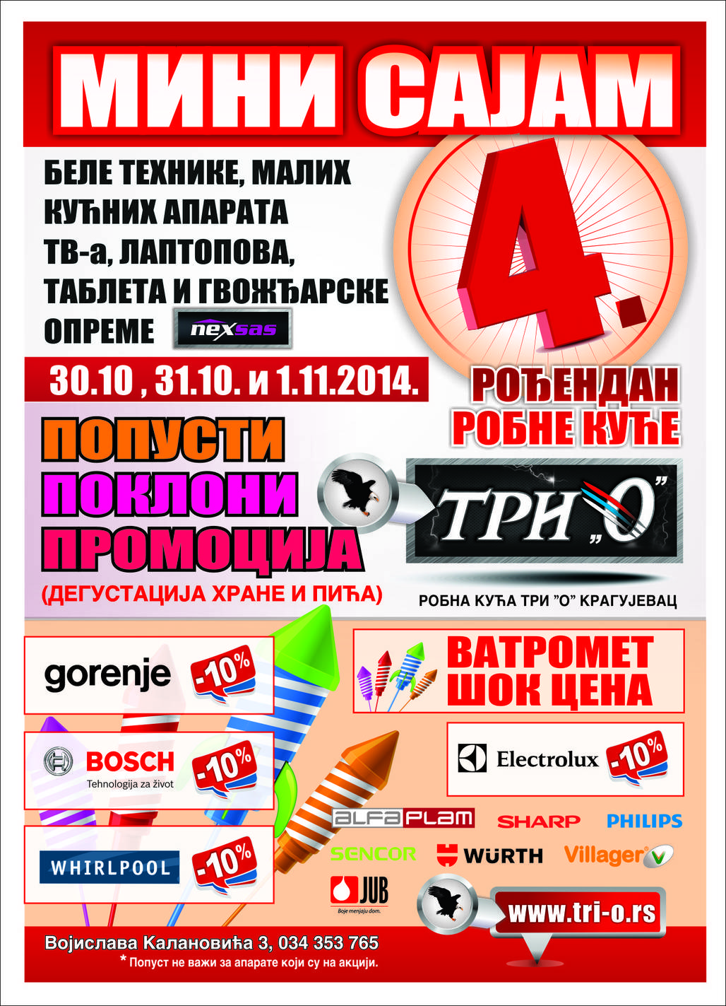 Preduzeće Tri "O" pripremilo je brojna iznenađenja povodom 4. rođendana svog najvećeg objekta - Robne kuće u Kragujevcu. Tri dana, 30.10, 31.10. i 1.11. biće organizovan Mini sajam bele tehnike, malih kućnih aparata, TV-a, IT programa i gvožđarske opreme, gde će sem popusta prilikom kupovine od 10 do 30%, biti organizovano niz promocija, pokloni iznenađenja za naše verne potrošače prilikom kupovine određenih artikala.