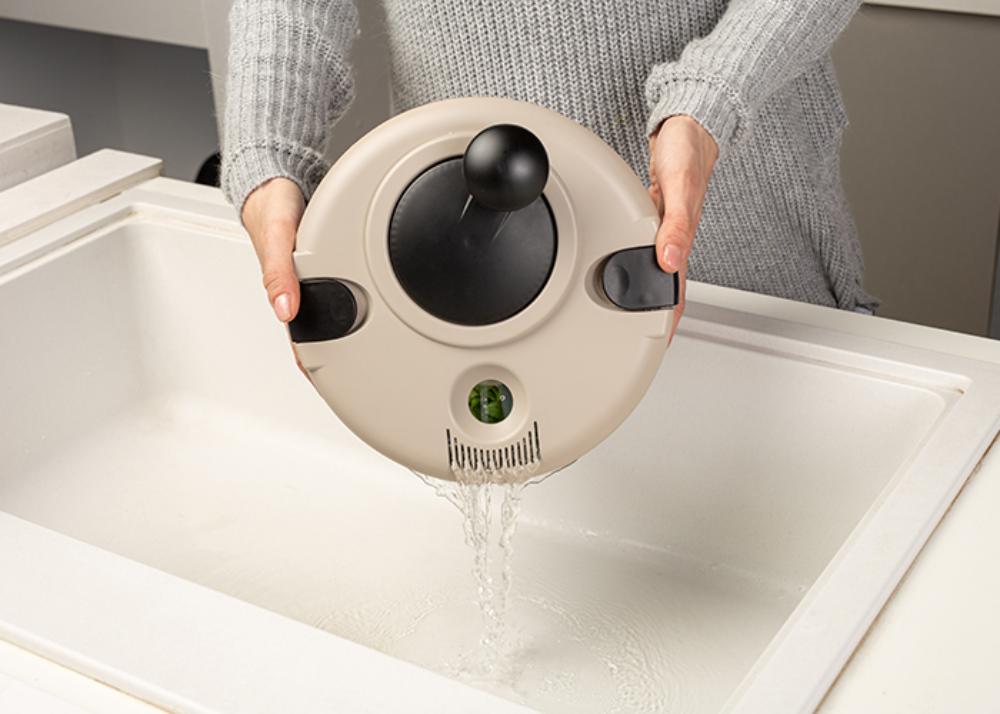 Posebno dizajnirani poklopac vam omogućava da dodate vodu kroz otvor koji se nalazi na vrhu ili da ispustite vodu, lako i brzo, bez otvaranja. Dve kopče pričvršćuju poklopac na činiji za stabilniju upotrebu. Nakon što dobro operete salatu, okrenite dugme na poklopcu kako biste uklonili višak vode.