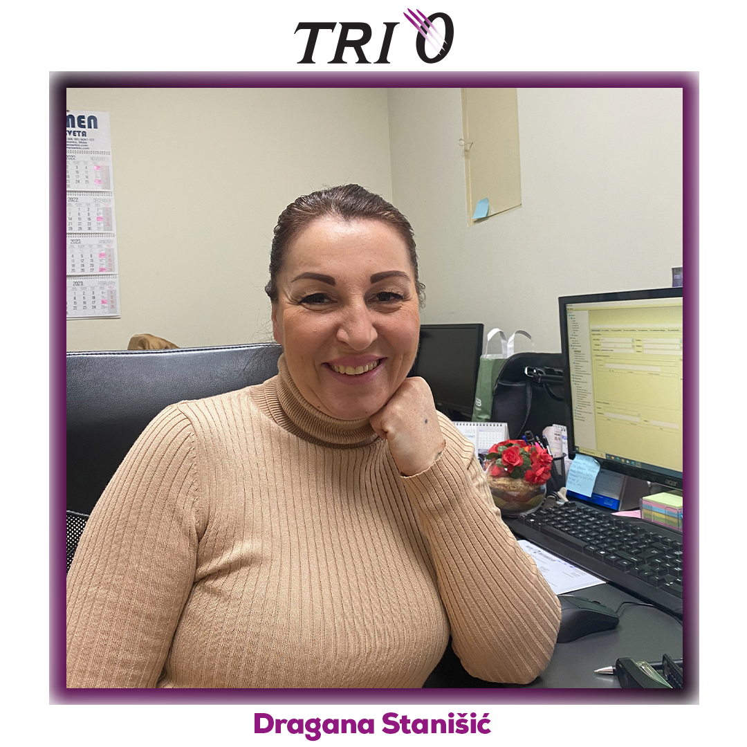 Njeno prisustvo, kako u poslovnom tako i u privatnom okruženju, je uvek zabavno, prijatno, opuštajuće, sa njom vreme brže prolazi, privatno čak i leti. Veoma je vidljiva razlika u godinama izmedju nas dve, ali ona je mene prihvatila prvog dana mog dolaska u firmu “Tri-O” (na moje prijatno iznenadjenje). Kako kažu današnji mladi, brzo smo se “skontale” i do danas ostale koleginice i drugarice.