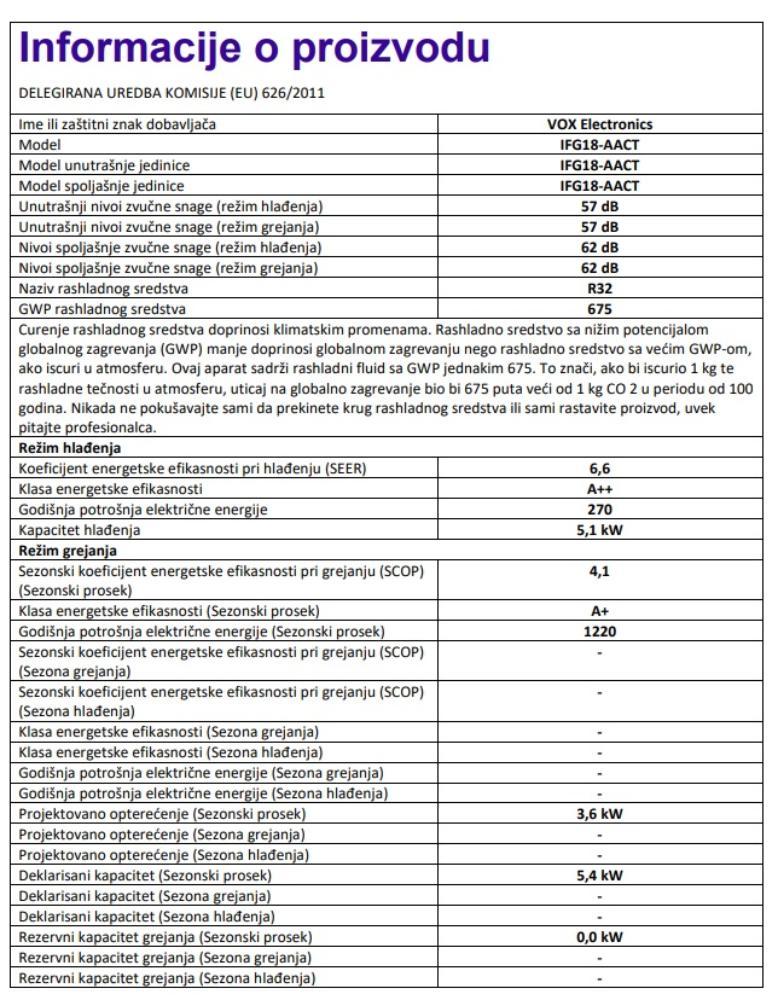 | Tehničke specifikacije | Automatsko čišćenje unutrašnje jedinice Da Kapacitet grijanja 5400 W Kapacitet hlađenja 5100 W LCD ekran Da Nivo buke spoljašnje jedinice 62 dB Nivo buke unutrašnje jedinice 57 dB Noćni režim rada Da Potrošnja struje pri grijanju 1400 W Potrošnja struje pri hlađenju 1520 W Protok vazduha (zatvoreno) (m3/h) 850 Raspon temperature (grijanje) -15 do +30°C Raspon temperature (hlađenje) +16 do +49°C SCOP koeficijent 4.10 SEER koeficijent 6.60 |
