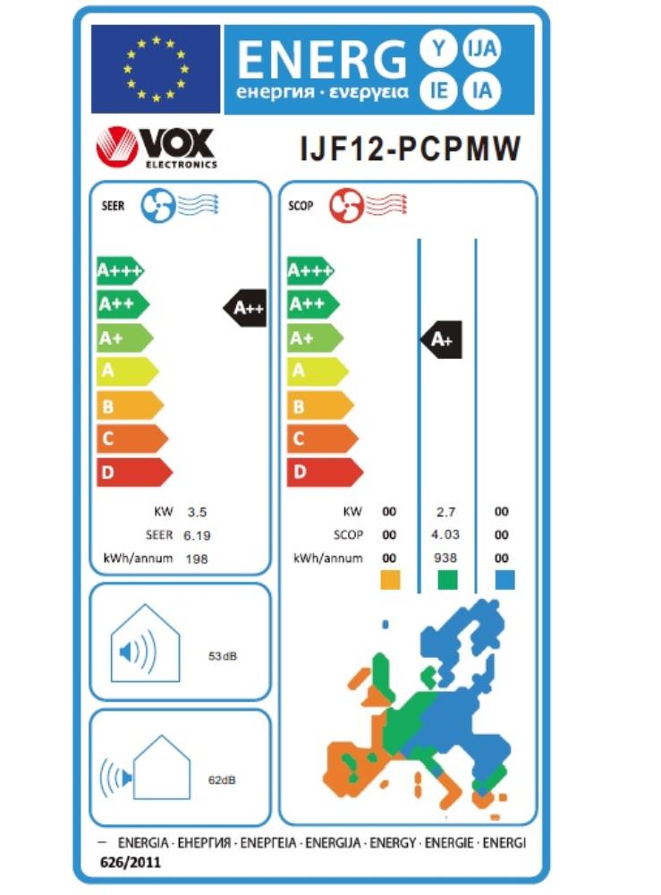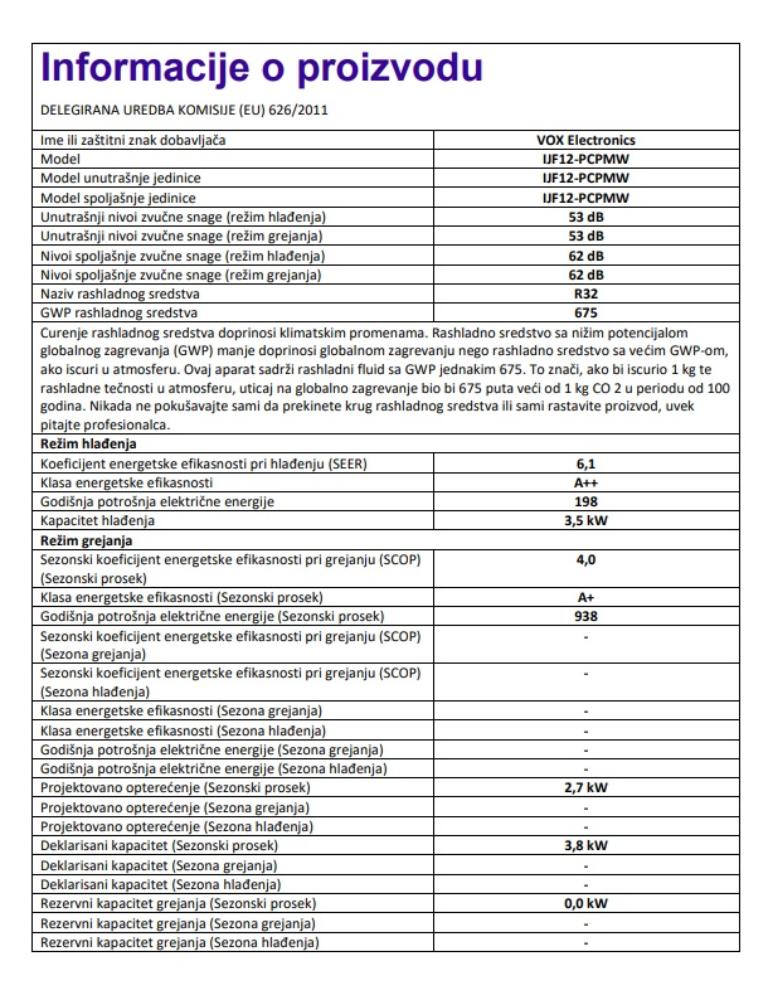 | Godišnja potrošnja električne energije | Potrošnja struje pri grejanju 1100 W Potrošnja struje pri hlađenju 1180 W |