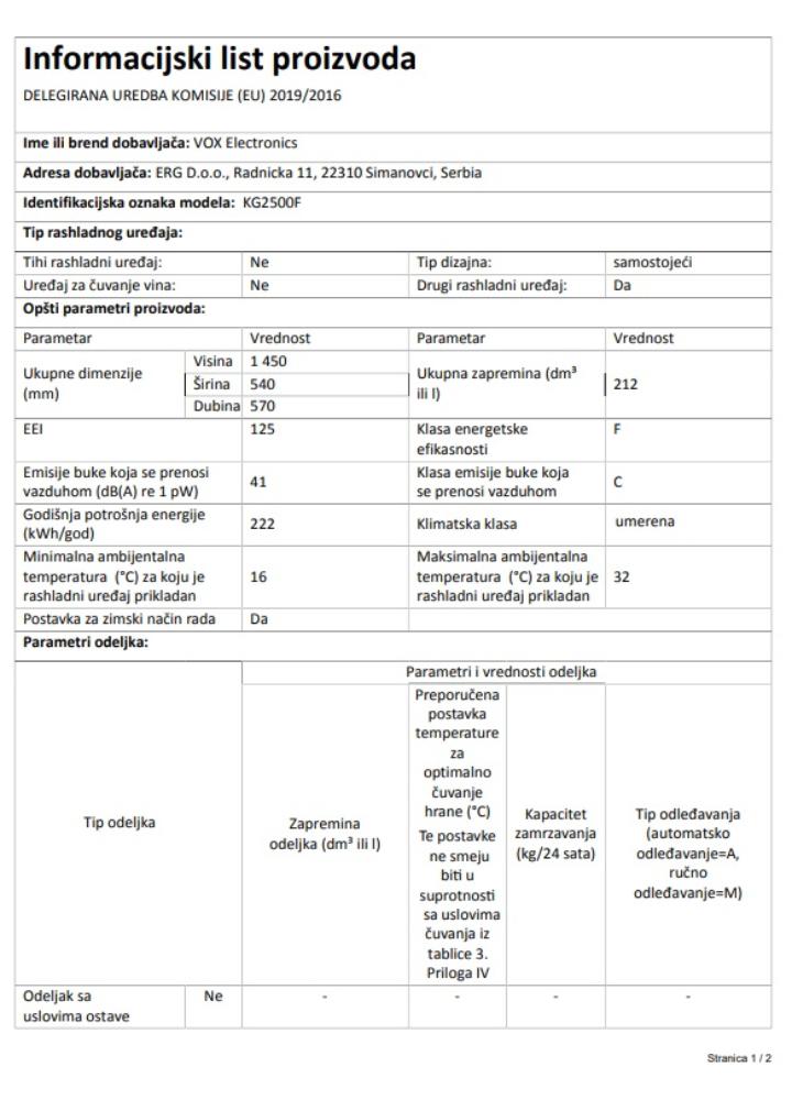 | Uredjenost | 3 staklene police, 1 fioka, 3 police na vratima |