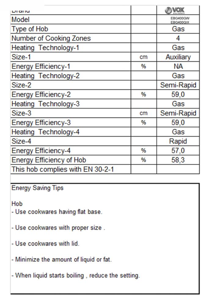 | Ploce/Zone za kuvanje | - Ringla 1: Mali gasni gorionik 55mm, 1000 W - Ringla 2: Polu-brzi gasni gorionik 75 mm, 1750 W - Ringla 3: Polu-brzi gasni gorionik 75 mm, 1750 W - Ringla 4: Brzi gasni gorionik 100 mm, 3000 W |