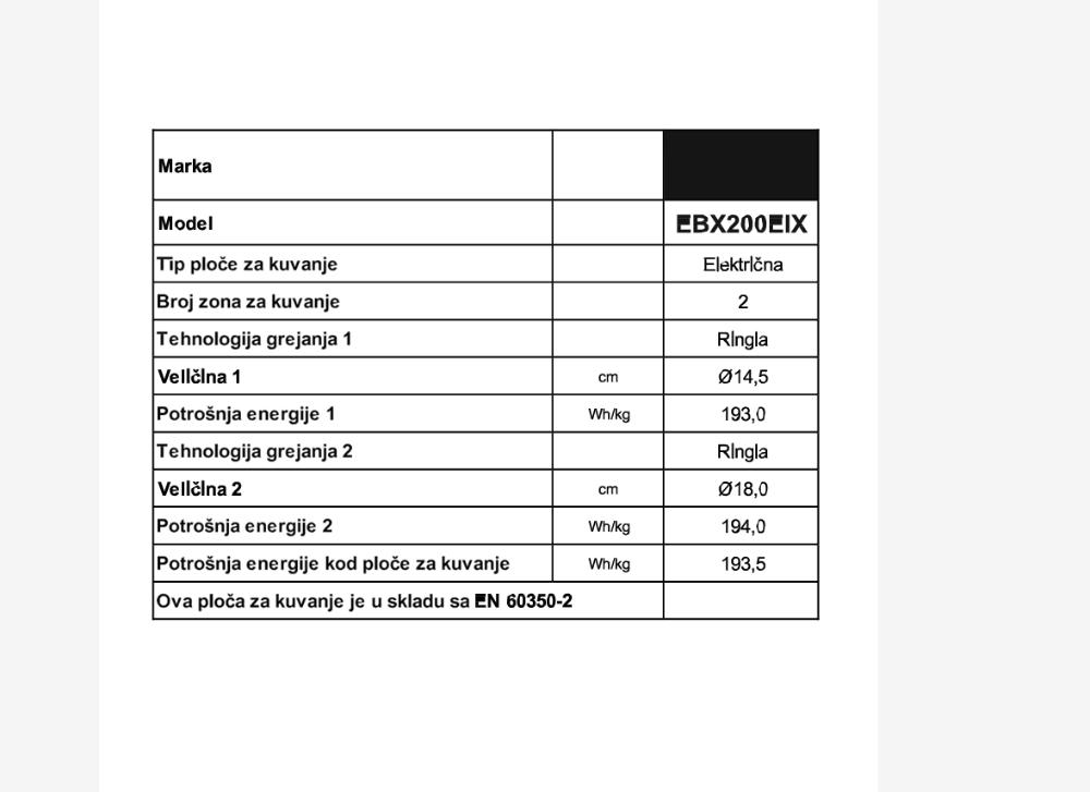 | Ploce/Zone za kuvanje | 2 zone za kuvanje: - Napred: Ø145 mm, 1 kW - Pozadi: Ø180 mm, 2 kW (ekspres ringla) |