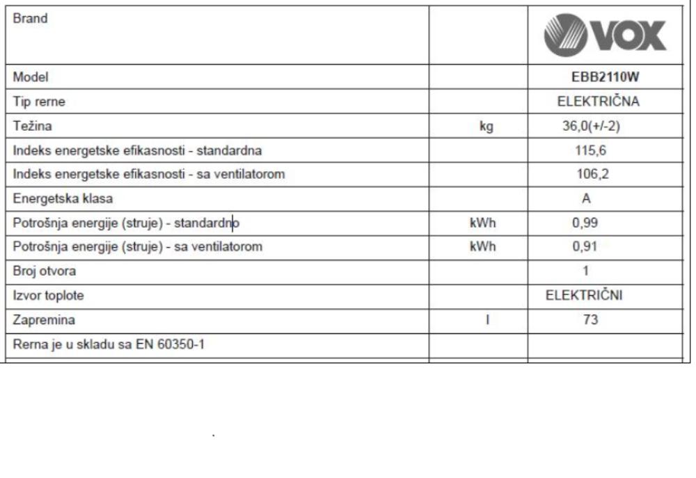 | Funkcije i karakteristike: | Svetlo u rerni; Grill; Ventilator; Puno staklo ,iznutra metalna vrata; Kontrola na prednjem panelu; Strujni kabl |